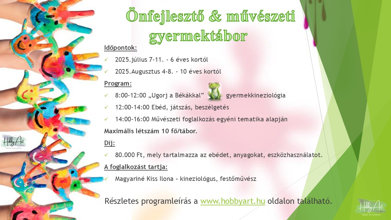 A tábor 5 egész napos, minden nap délelőtt Ugorj a békákkal gyermektanfolyamon vesznek részt a gyerekek, mely kifejezetten nekik kifejlesztett kineziológiai eszközökön, módszereken alapuló program, majd ebéd után, délután, rajzolunk és festünk, jobb agyféltekés módszerrel, egyéni tematika alapján.