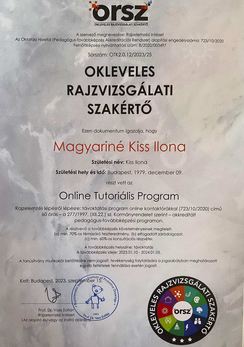 A hívatásomon kívül érdeklődöm a képzőművészet iránt is, több éve rajzolok, festek. 2024. elején sikeres vizsgát tettem a Rajzelemzési Intézet Okleveles Rajzvizsgálati Szakértő szakán, és nem volt kérdés számomra, hogy ebben az irányban fog mozdulni a hivatásom.